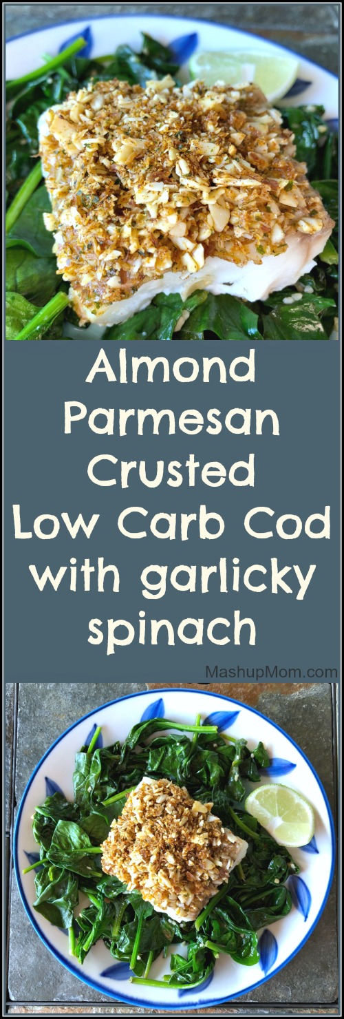 Almond Parmesan Crusted Low Carb Cod with garlicky spinach, printable recipe