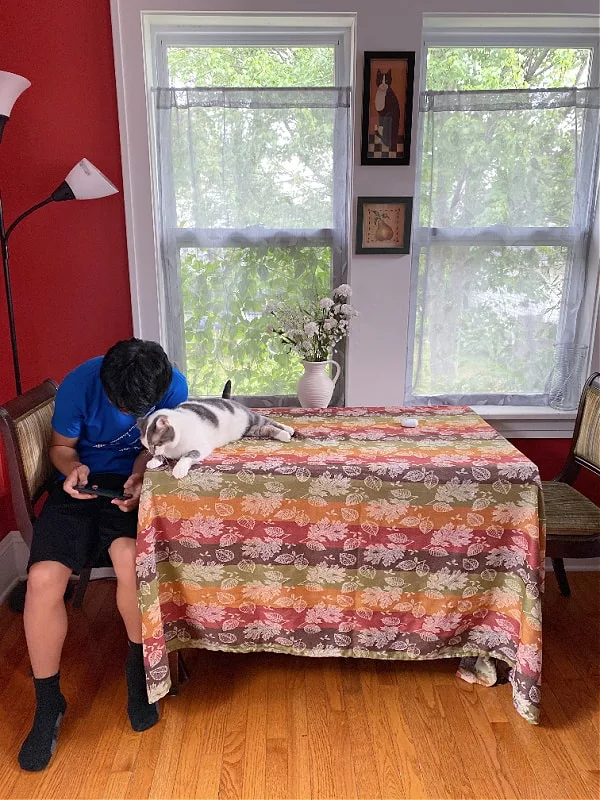 Or hey, maybe it's just her boy she loves -- despite the whole pet towel and other related incidents. (Speaking of cats, I have a couple of these grumpy-ish cat pieces of artwork like the one above the table above: One of my better thrift store finds, and I think I've finally settled on between the windows here as being the perfect spot for this one.)