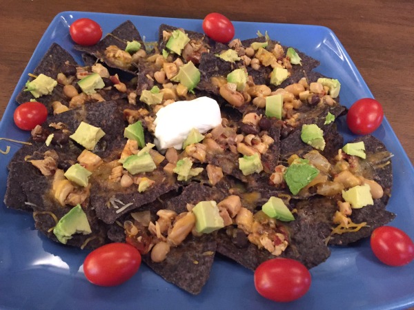 - Nacho fixings of choice -- I used tortilla chips cheese, sour cream, tomatoes, and diced avocado