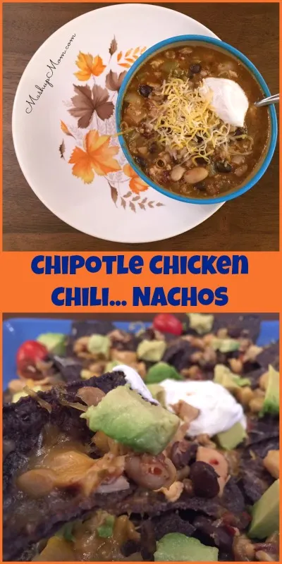 Serve chili with normal chili accompaniments (toast, cornbread, or tortilla chips, cheese and/or sour cream...) or use in Chipotle Chicken Chili... NACHOS. Arrange tortilla chips on a microwave safe plate and top with chili, cheese, and other nacho toppings of choice. Layer as many times as desired. Microwave for one minute, then add avocados or guacamole, sour cream, grape or diced tomatoes, and/or salsa...