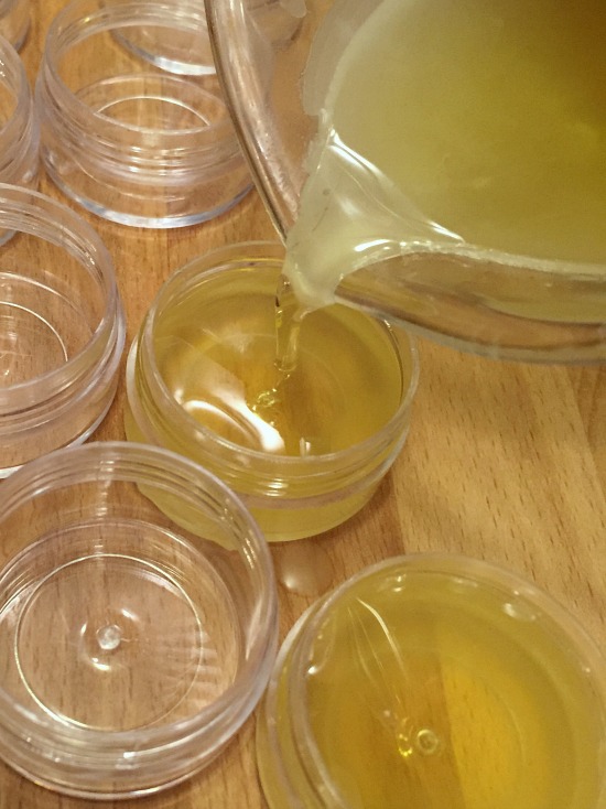 I then repeated the spoon test to make sure the consistency was perfect. After determining that it was good, I quickly filled the containers. (Once the wax starts to cool, it's impossible to work with.) Because I was using a Pyrex container, I could hold the top of it in my bare hand and quickly fill the containers with the hot liquid.