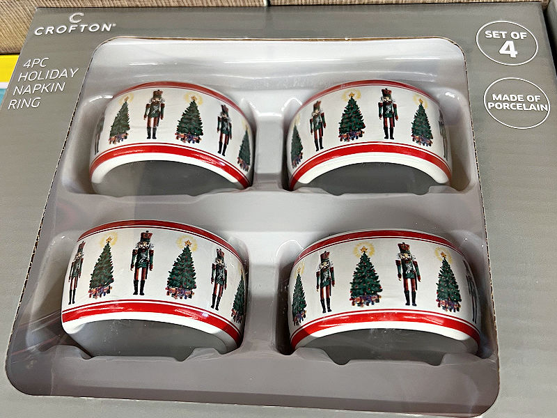 Check out these festive holiday napkin rings (and they also have matching serving utensils), $8.99 each. Also for your holiday cooking, look for $6.49 Crofton baking accessories such as glass measuring cups, rolling pins, and fine mesh sieves.