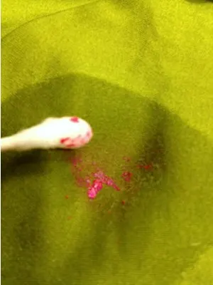 Ta-da! Since this is rubbing alcohol, it also evaporated really quickly and left the shirt dry. This was kind of like magic -- it removed the smaller nail polish stain in just four Q-tips (both ends), though I did have to scrub a little at the end to get the last stubborn bits off.