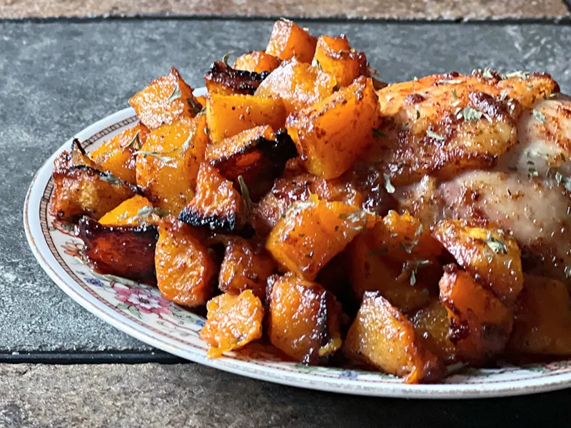 - Serve your sweet & spicy chicken alongside the totally delectable, melt-in-your-mouth, deliciously caramelized butternut squash! (I topped mine with a bit of dried parsley for the photos, but that’s optional.)