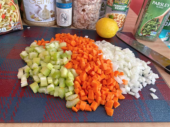 - Peel and dice the carrots. Cut up the celery, onion, and garlic.